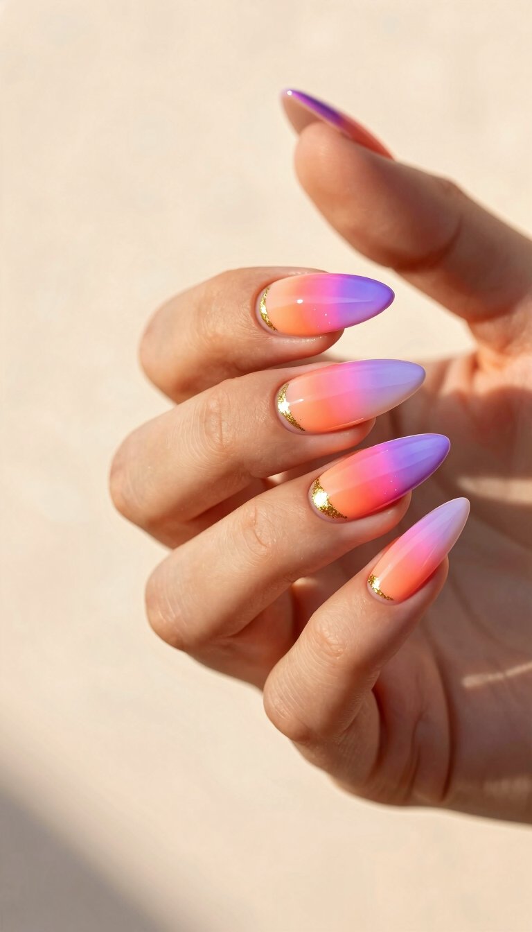 Soft transitions between baby blue, lavender, and mint green give these nails a dreamy, cotton candy effect. The almond shape elongates the gradient, making it look seamless. It’s a subtle but stunning choice for everyday wear. Plus, it matches literally every summer outfit in your closet.