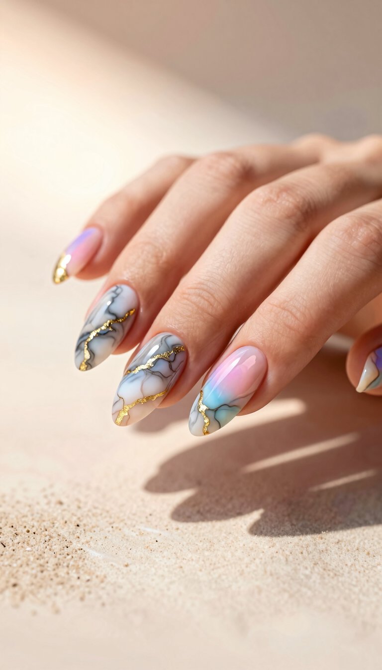 Swirls of gray, white, and gold that mimic natural marble. It’s elegant and timeless, but with a summer twist by adding pastel hues. The almond shape enhances the sophisticated stone-like effect. It’s like having a piece of artisanal countertop on your hands—but way cooler.