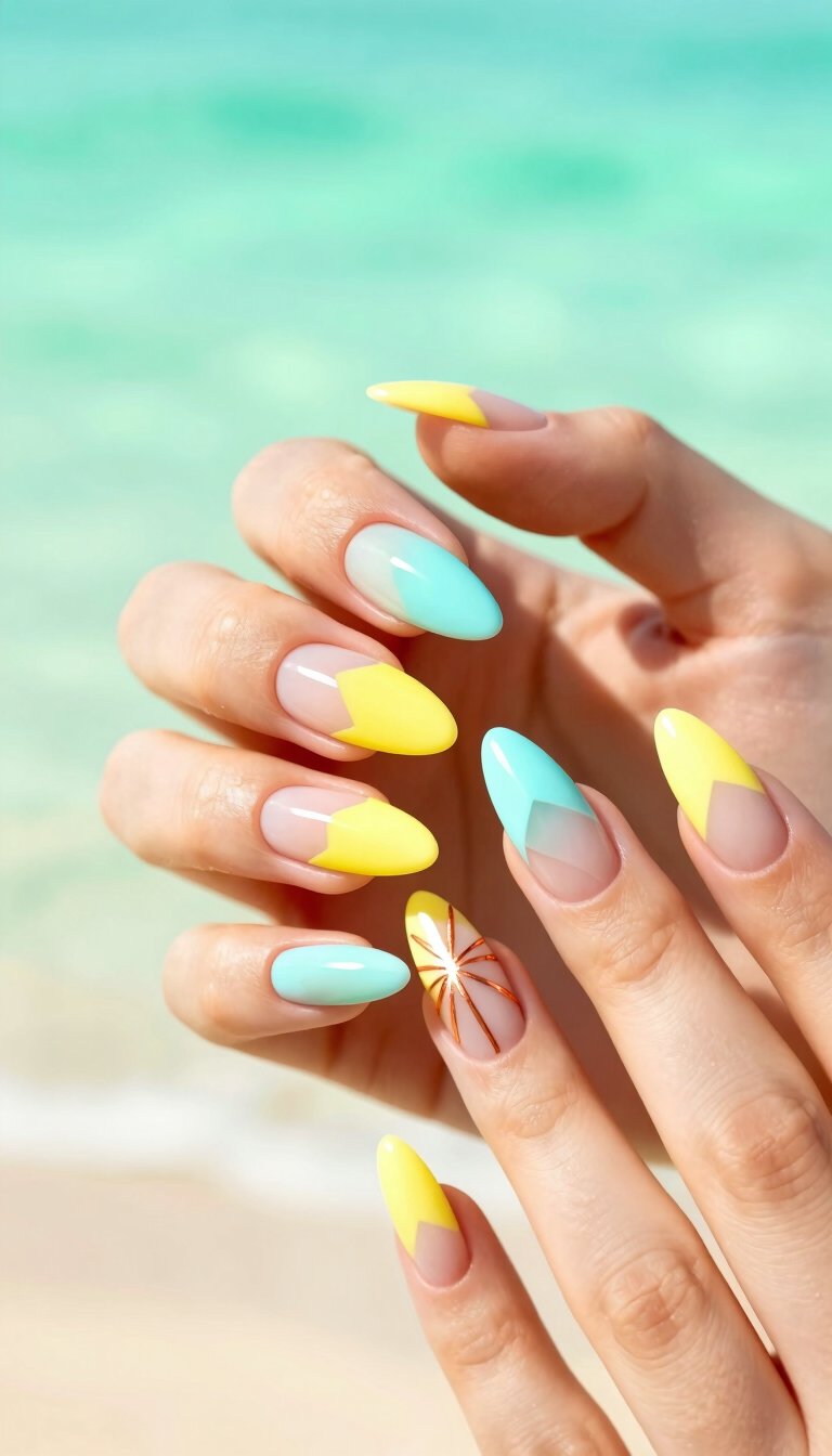 Soft, blended patches of color that look like they were painted with watercolors. Think blues, pinks, and yellows melting into each other. The almond shape allows the colors to flow beautifully. It’s artistic and effortless, like you just dipped your fingers in a summer rainbow.