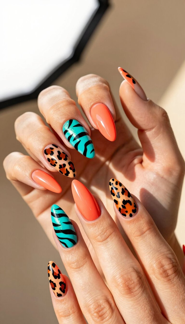 Leopard, zebra, or snake prints in summer colors like coral or turquoise. The almond shape softens the wild pattern, making it wearable and trendy. Go for ferocious but fashionable this season. After all, why shouldn’t your nails have a little wild side?
