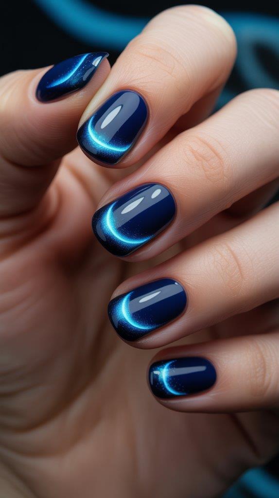 Ever seen those photos of the ocean glowing blue at night? Imagine that on your nails. You ask your tech for a deep, jelly navy base and swirl in electric blue cat-eye polish at the tips. When the light hits it, it glows. It looks like magic. It’s mysterious, sexy, and perfect for late-night beach parties.