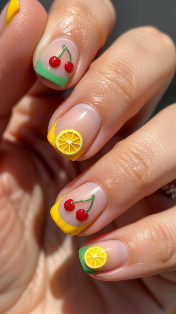 Okay, I know I said no literal coconuts, but tiny fruit is the exception. Paint a classic French tip in a bright color, like yellow or lime green. Then, add microscopic cherries or lemon slices just along the smile line. It’s subtle. You have to squint to see it, which makes it chic rather than childish.