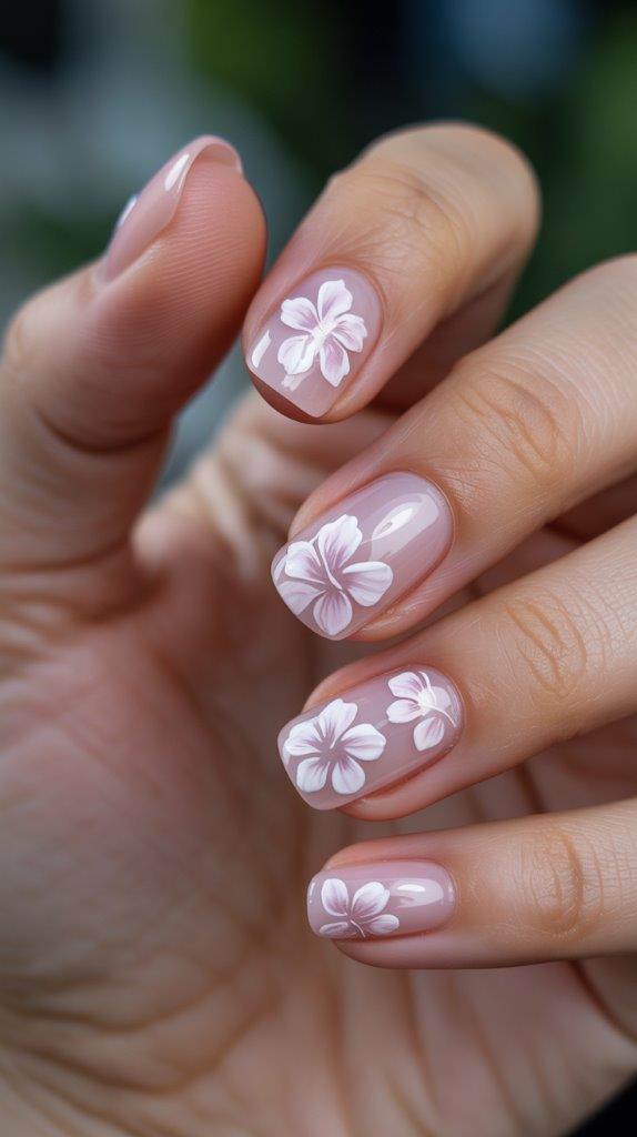 Jelly polish is still king in 2026. You layer a sheer pink jelly base and hand-paint ghost-like, white hibiscus flowers inside the layers. The depth makes the flowers look suspended in ice. It’s cooling, pretty, and doesn’t scream “tourist.”