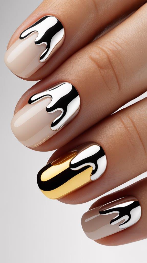 This is for the edgy girls. You take a neutral base and drip silver or gold chrome down from the cuticle. It should look like the Terminator is melting on your fingers. It’s messy, artistic, and hides regrowth perfectly. (Laziness, but make it fashion. You’re welcome.)