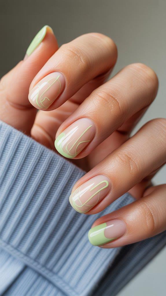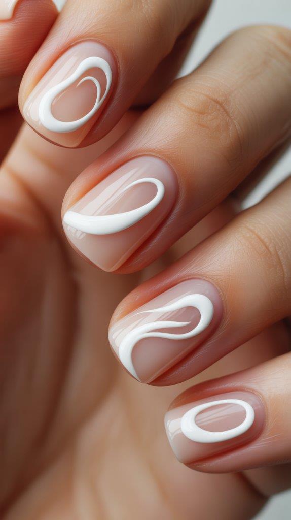 You take a nude base and paint a single, thick white or pastel swirl across the nail. The key is the negative space. Less is more. It looks like modern art hanging in a gallery.