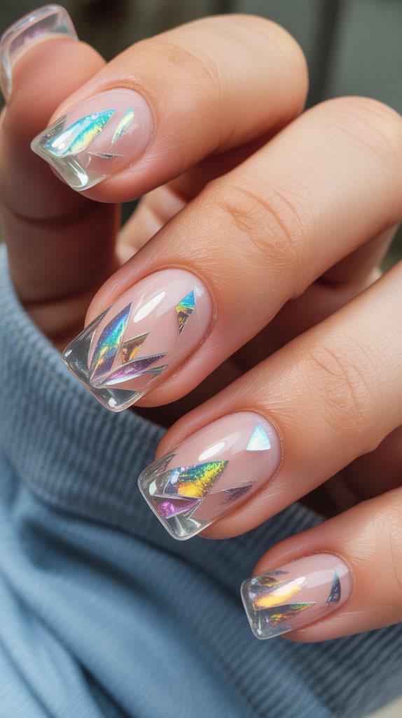 You cut tiny, jagged pieces of holographic foil and encapsulate them in clear gel. It looks like shattered glass. When you move your hand, it reflects every color of the rainbow. Caution: You will distract yourself while driving.