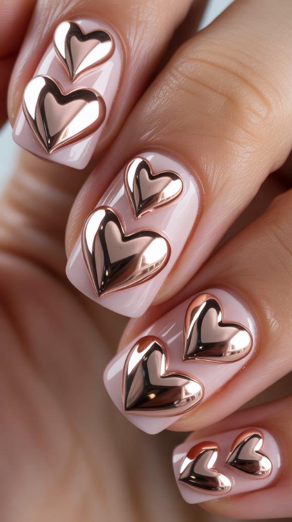 Y2K style refuses to die; it just evolves. We are molding 3D hearts out of builder gel and rubbing chrome powder over them. It gives a puffed, metallic sticker effect. Put one on your ring finger as an accent or go crazy with one on every nail.