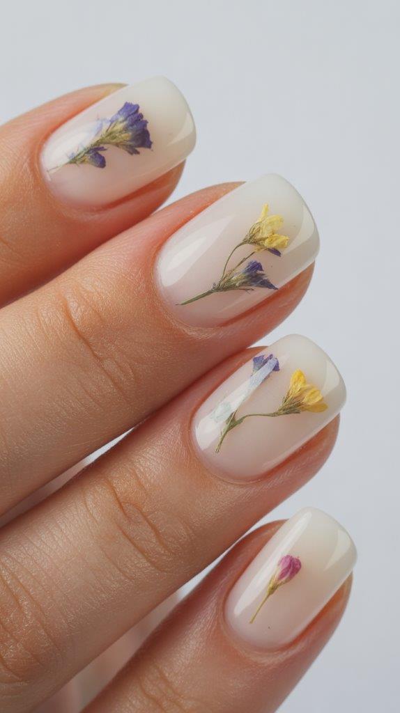 This is the wedding guest staple. You suspend tiny, dried pressed flowers in a milky white builder gel. It looks soft, romantic, and feminine. I wore this to a wedding last July, and it matched every outfit I packed.