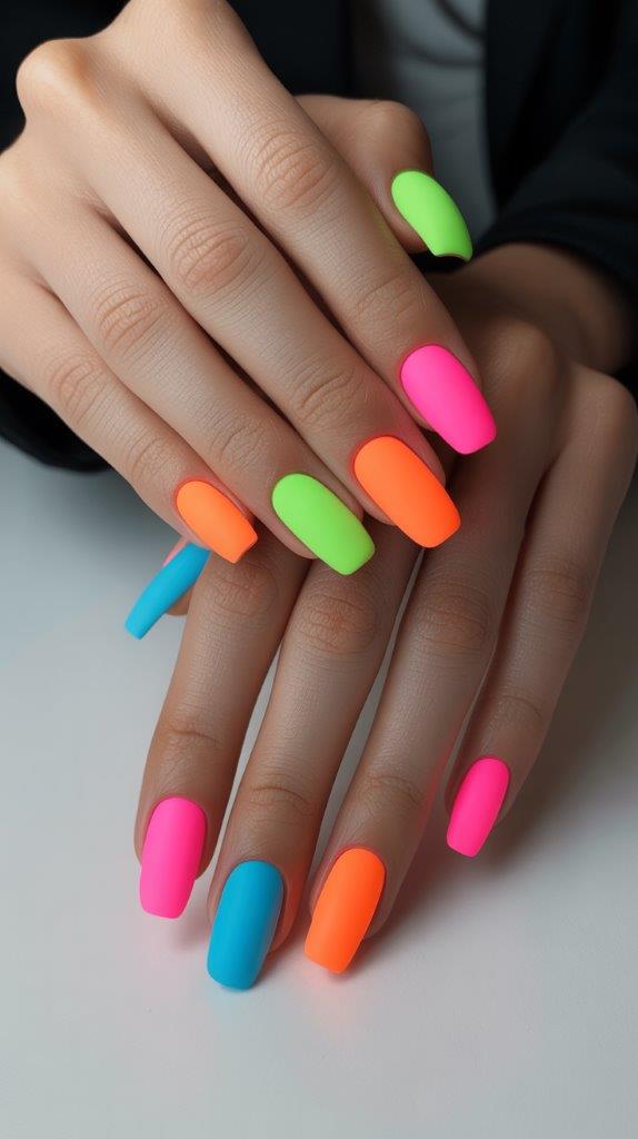 Can’t decide on a color? Don’t. Paint every nail a different neon shade. Pink, orange, green, blue, yellow. The key to 2026 styling is the finish: make them matte. The matte top coat makes the neon look like velvet or chalk.