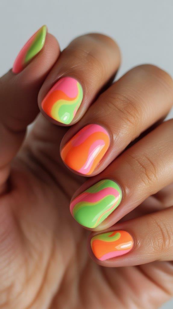 You drop three different neon jelly polishes onto the nail and swirl them while they are wet. Because they are jelly (translucent), they blend into new colors where they overlap. It looks like a melted popsicle.