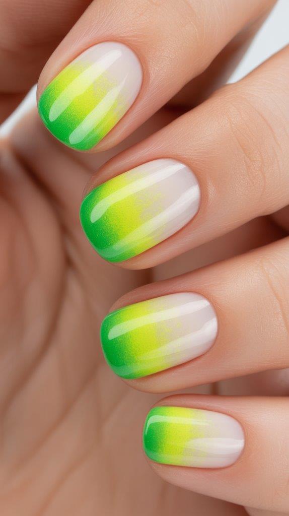 Start with a white base to make the colors pop. Then sponge on neon yellow at the cuticle fading into neon green at the tip. It’s blindingly bright. Perfect for festivals or raves.