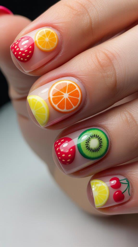 We talked about painted fruit, but this uses actual dried slices of fimo clay fruit. You bury them under a thick layer of clear hard gel. It looks like a fruit tart. It adds depth that flat polish just can’t achieve.