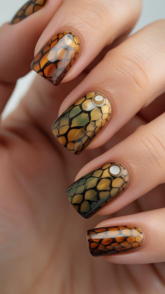 Okay, hear me out. You use blooming gel to create a scaly, snake-skin pattern in bright greens or turquoise. Then you add clear dots over the “scales” to lift them up. It’s exotic and feels cool to the touch.