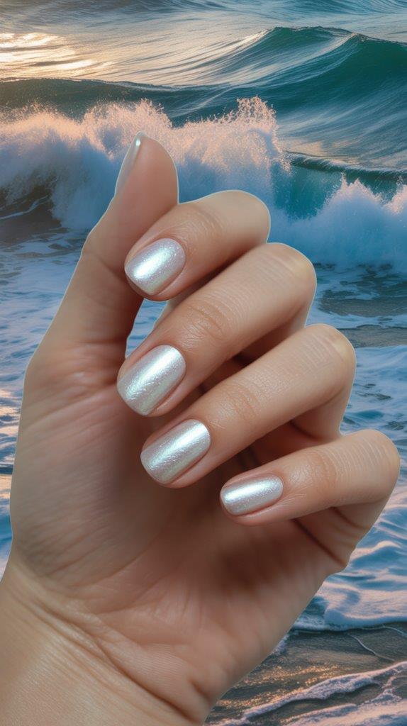 We aren’t letting go of the mermaid aesthetic just yet. Pearl chrome uses a white iridescent powder over a sheer nude base to create a shell-like glow. On square nails, this looks incredibly “old money” and polished. It’s the perfect choice if you want to look like you own a yacht, even if you’re just renting a paddleboard.