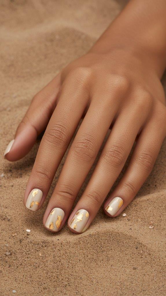 If your vacation involves a desert music festival or a trip to the dunes, go for the gold. The gold flake desert design uses a sandy beige base with random flecks of gold leaf scattered across the top. It looks expensive, earthy, and hides any actual sand that might get under your nails. It is the ultimate boho-chic choice for 2026.