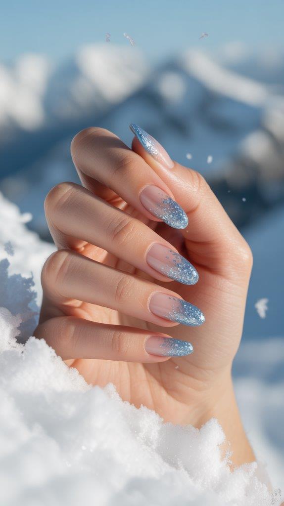 Ready to let it go? 😉 This design is pure magic. Start with a sheer, nude base at the cuticle and blend it into a beautiful, icy blue glitter at the tips. The fade effect looks like your fingertips have been dipped in Elsa’s magic.