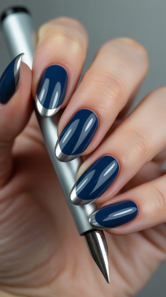 For a more dramatic and sophisticated look, a deep, glossy navy blue is a fantastic choice. Turn it into a modern French manicure by adding a crisp, metallic silver line at the tip. The contrast between the dark blue and the bright silver is incredibly striking.