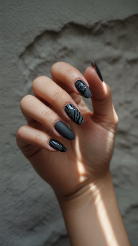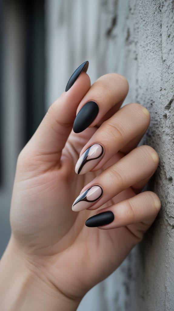 I love a good texture play. A full set of black matte nails is already incredibly chic and edgy. To add a bit of artistic flair, have your nail tech paint a single, elegant swirl or line on each nail with a glossy top coat. The contrast between the two finishes is subtle but so effective.