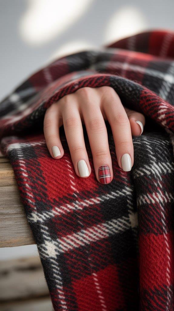 You don’t need to go full lumberjack. A chic way to wear plaid is on a single accent nail. Paired with solid colors pulled from the plaid pattern (like deep red and cream), a touch of plaid adds a cozy, festive feel without being overwhelming.