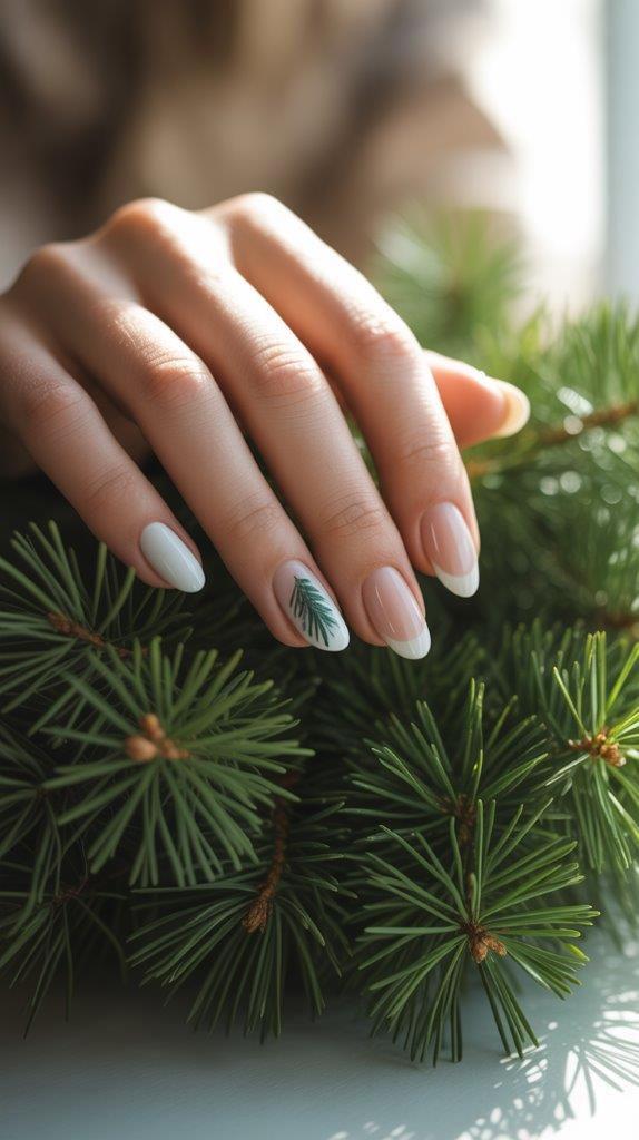 For a touch of nature-inspired art, this is a beautiful choice. On a neutral or milky white base, have a single, delicate pine branch hand-painted on an accent nail. It’s an elegant and artistic nod to the winter season.