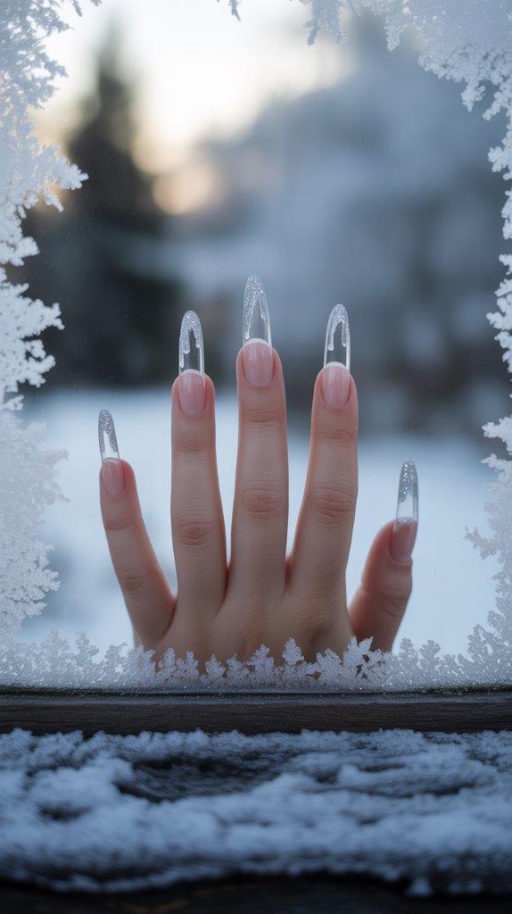 This is a cool, modern take on a glitter tip. A silver or holographic glitter is applied at the tip of the nail and then painted downwards in thin, uneven lines to look like sparkling, melting icicles. It’s a dynamic and eye-catching design.