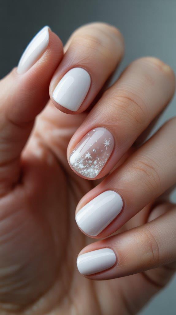 This is a truly magical design. One nail is left clear or has a very sheer, pearlescent base. Then, tiny glitter, stars, or snowflake confetti are encapsulated within the acrylic. When you move your hand, the little pieces shift, just like a real snow globe. It’s a conversation starter for sure!
