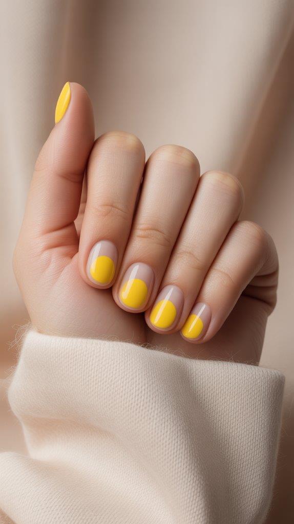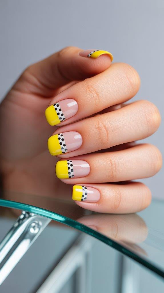 Love the idea of yellow and dots but need something more understated for the office? This one’s for you. Paint your nails a soft, barely-there nude or pale pink. Then, add a thin, sunny yellow French tip. On just one or two accent nails, place a tiny, meticulous row of black or white polka dots along that yellow smile line. It’s a subtle, sophisticated nod to the trend that feels professional but secretly playful.